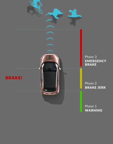 The new 500e system works with three levels of intervention: acoustic, visual warning and braking jolt. If any danger is detected, the system automatically brakes the vehicle to avoid or mitigate a collision with the vehicle in front, pedestrian or cyclist. In addition, the system will also warn you if the vehicle is not calibrated and if the camera if blinded or failing.